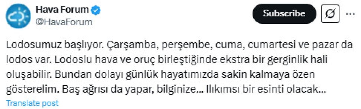 "Lodosumuz başlıyor. Çarşamba, perşembe, cuma, cumartesi ve pazar da lodos var. Lodoslu hava ve oruç birleştiğinde ekstra bir gerginlik hali oluşabilir. Bundan dolayı günlük hayatımızda sakin kalmaya özen gösterelim. Baş ağrısı da yapar, bilginize... Ilıkımsı bir esinti olacak..."