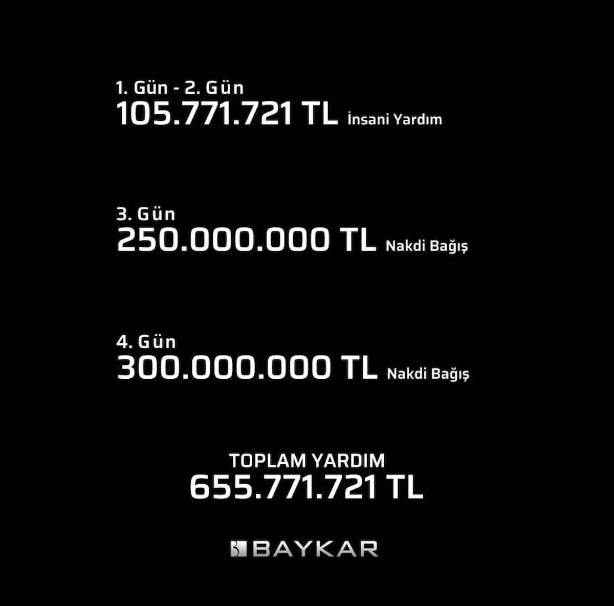 Baykar Yönetim Kurulu Başkanı ve Teknoloji Lideri Selçuk Bayraktar, sosyal medya hesabından yaptığı paylaşım ile Kahramanmaraş depremi için şimdiye kadar toplamda 655 milyon TL’lik yardım yaptıklarını duyurdu.