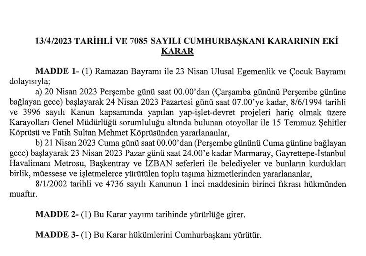 Resmi Gazete’de yayınlanan karara göre Ramazan Bayramı boyunca İstanbul, İzmir ve Ankara’da toplu taşıma ücretsiz olacak. Ayrıca bütün köprü ve yollar da ücretsiz olacak.