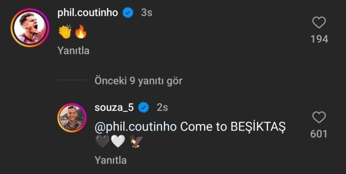 Coutinho, Josef De Souza’nın fotoğrafına emoji bıraktı. Josef De Souza ise “Come To Beşiktaş” sözleriyle yanıt verdi. Ancak Coutinho yanıta herhangi bir tepki vermedi.