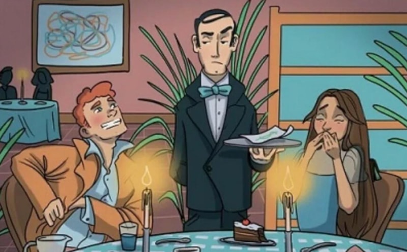 Aşağıda vereceğimiz görselde bir restoranda yemek yiyen erkek ve kadın yer alıyor. Yemeklerini bitiren çift hesabı ödemek istiyor ancak küçük bir sorun var.