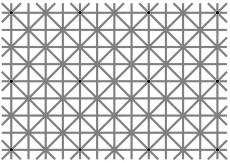 Will Kerslake, bu optik ilüzyonu paylaşırken "Çizgilerin kesiştiği yerlerde 12 siyah nokta var ama beynimiz tek seferde hepsini görmemize izin veremez" diyordu.