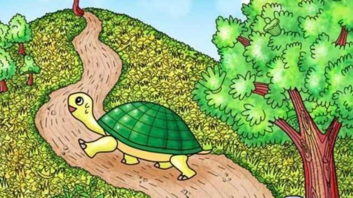 Neşeli bir kaplumbağa istikrarlı bir şekilde ilerlerken, uykulu bir tavşan bir ağaca yaslanarak uyukluyor ve "Kaplumbağa ve Tavşan"ın klasik masalını canlandırıyor.