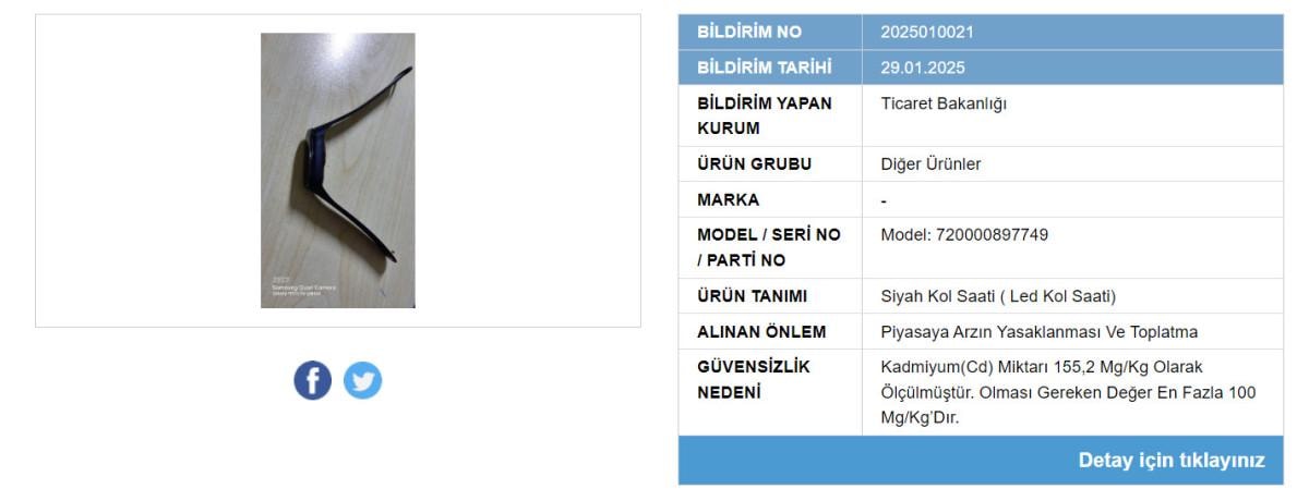 Bakanlık tarafından yapılan açıklamada, siyah renk led kol saatine yapılan testlerde, sınır değerinin üzerinde kadmiyum bulunduğu tespit edildi.