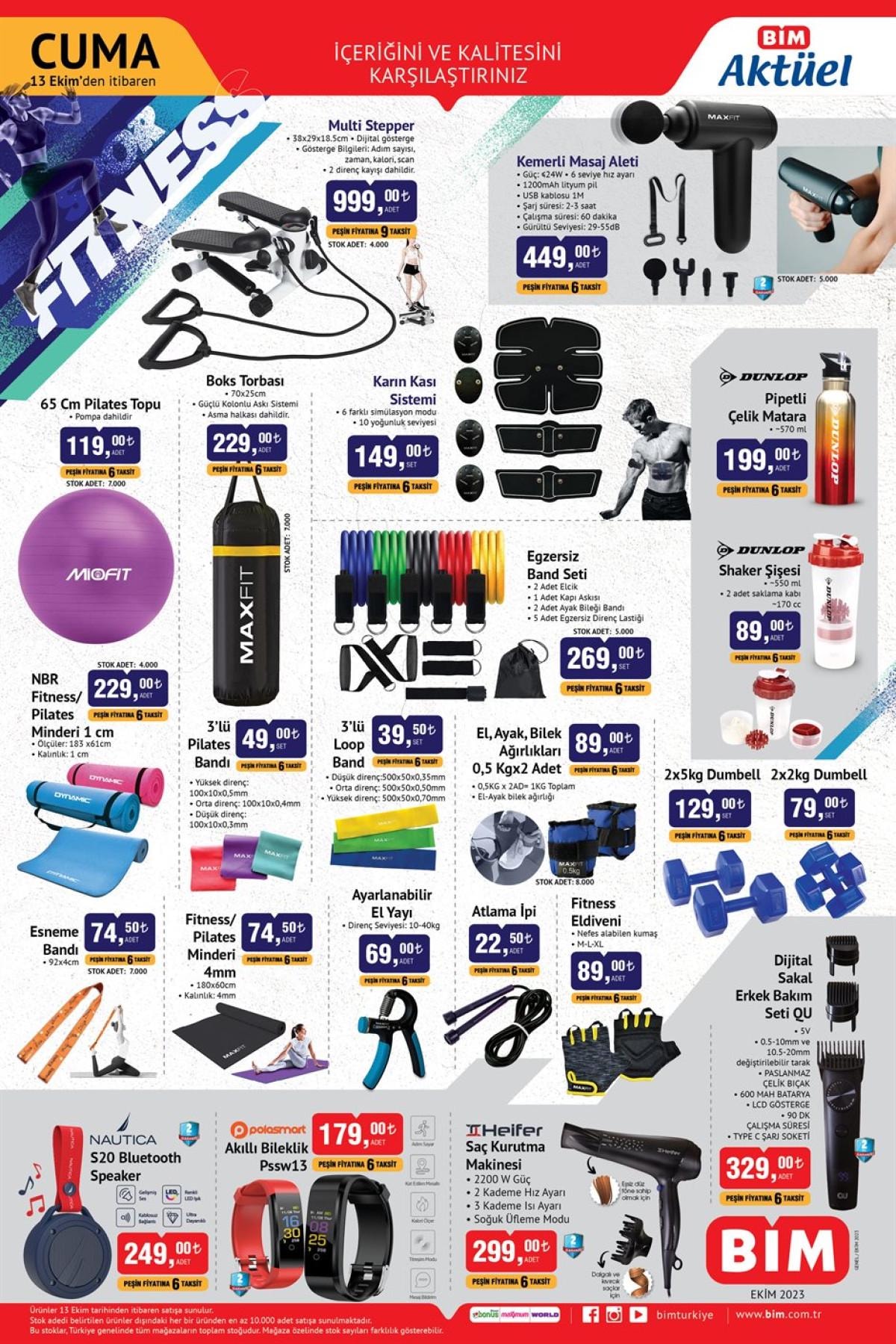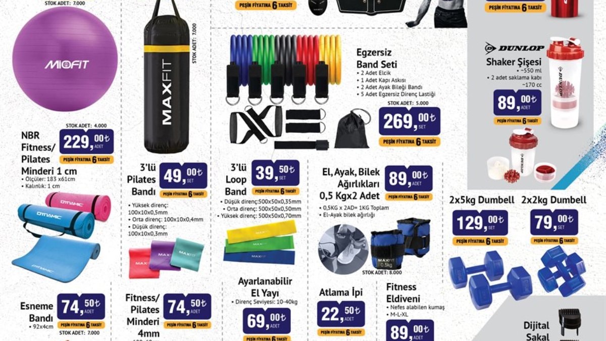 Pilates topu, boks torbası, spor çanta, spor tayt, masaj aleti, dambıl, bant gibi birçok ürün indirimli fiyatlarla satışta olacak.