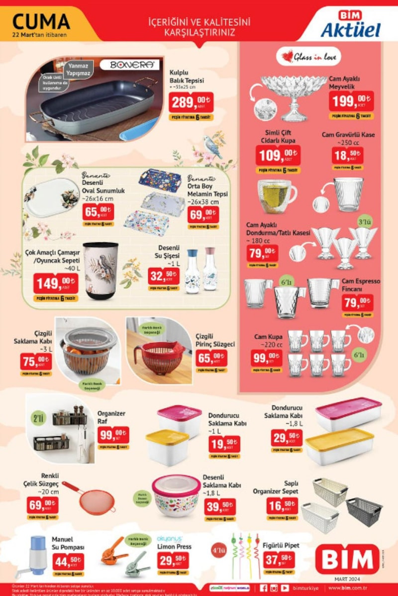 BİM'in 22 Mart 2024 kataloglarında nelerin yer aldığı, hangi ürünlerin hangi fiyatlarla satılacağı ve hangi ürünlerin indirimde olduğu gibi merak edilen detaylar, bu özel katalogda yer alıyor.