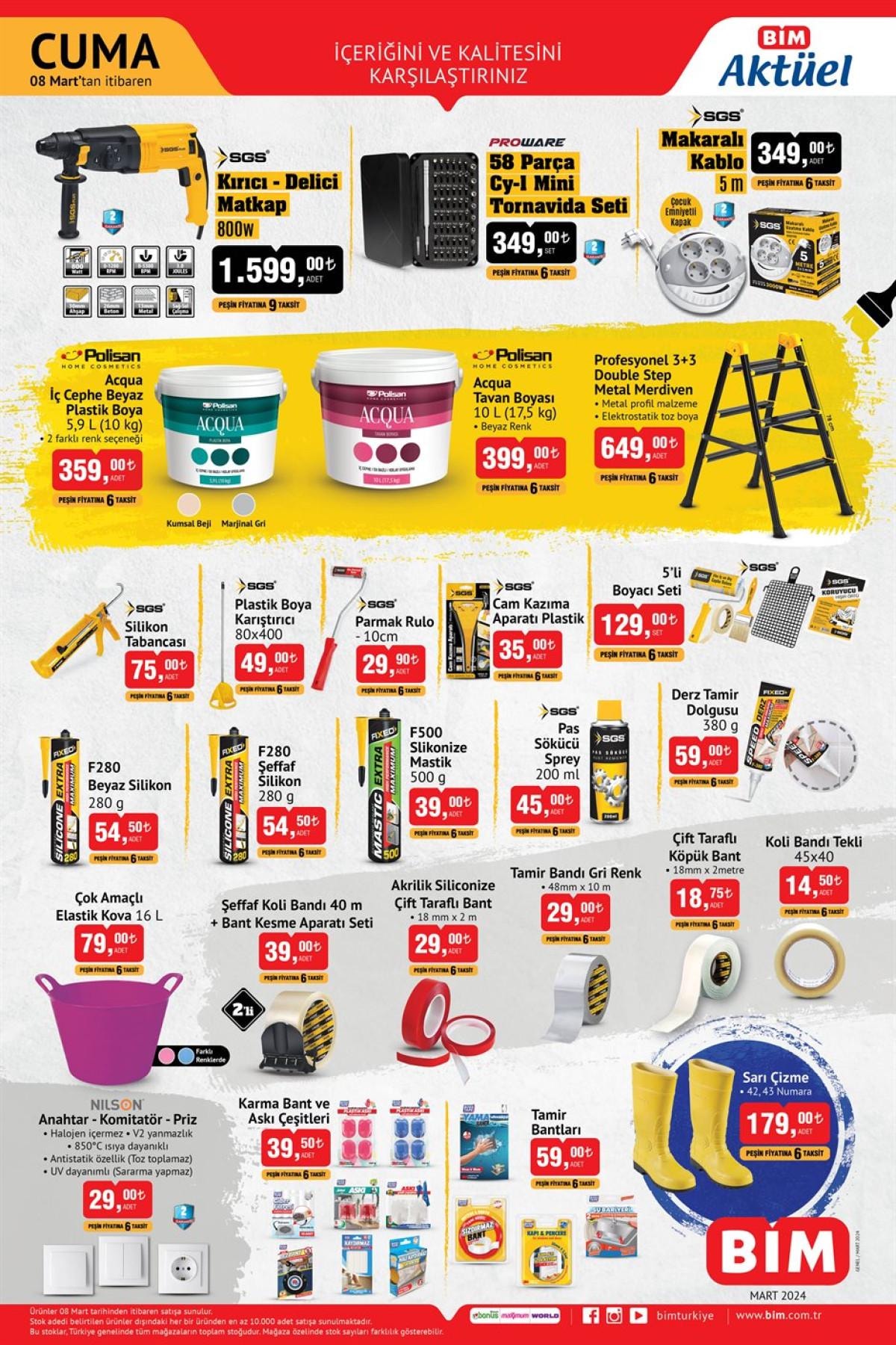Bim Aktüel Kataloğu, 8 Mart 2024 tarihli yeni dönem kampanyalarında, elektrikli el aletleri, boya ve tadilat malzemeleri, ev eşyaları, züccaciye ve mutfak ürünleriyle dolu.