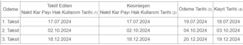 - Nakit kâr payı dağıtımının üç taksit halinde, ilk taksitin 17.07.2024 tarihinden itibaren her bir pay için brüt 2,00 TL olarak, ikinci taksitin 02.10.2024 tarihinden itibaren her bir pay için brüt 4,00 TL olarak, üçüncü taksitin ise 18.12.2024 tarihinden itibaren her bir pay için brüt 4,00 TL olarak dağıtılmasına, karar verilmiştir.