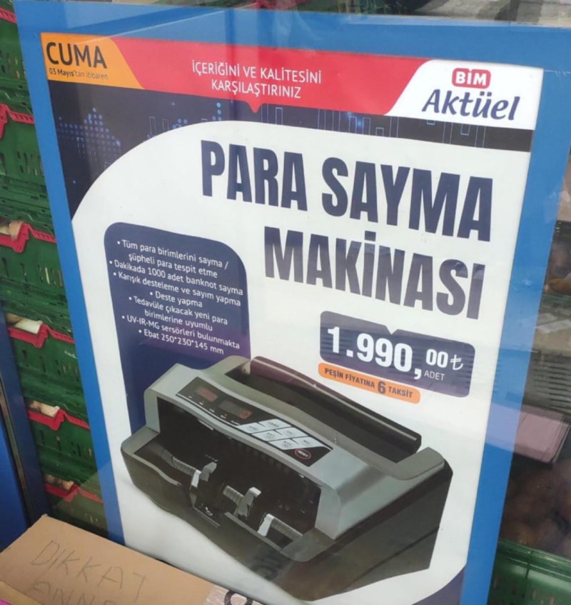 Aktüel ürün çeşitleriyle dikkat çeken BİM, bu sefer de para sayma makinesini satışa sundu. Özellikleri arasında yer alan" tedavüle çıkacak yeni para birimlerine uyumlu" ibaresi dikkat çekti.
