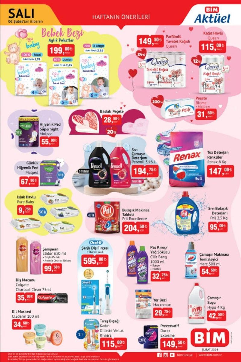 Evin temizliğine önem verenler için ise şampuan, şarjlı diş fırçası, yer bezi, çamaşır suyu, çamaşır makinesi temizleyici, bulaşık makinesi tableti, sıvı bulaşık deterjanı, ıslak havlu, sıvı çamaşır deterjanı, toz deterjan ve baskılı peçete gibi ürünler indirimde!
