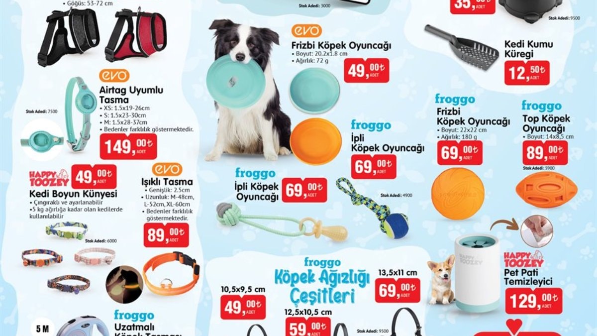Kedi ve köpek sahipleri için mama kapları, tasma çeşitleri, evcil hayvan bakım ürünleri ve oyuncaklar yer aldı.