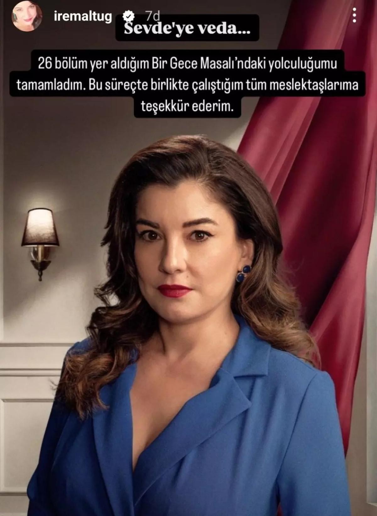Altuğ, "26 bölüm yer aldığım Bir Gece Masalı'ndaki yolculuğumu tamamladım. Bu süreçte birlikte çalıştığım tüm meslektaşlarıma teşekkür ederim" sözleriyle veda etti.