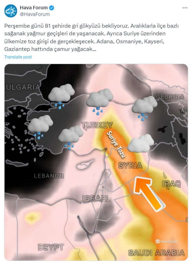 Meteoroloji kaynağı Hava Forum, sosyal medya hesabından çamur yağmuru uyarısını şu sözlerle yaptı: