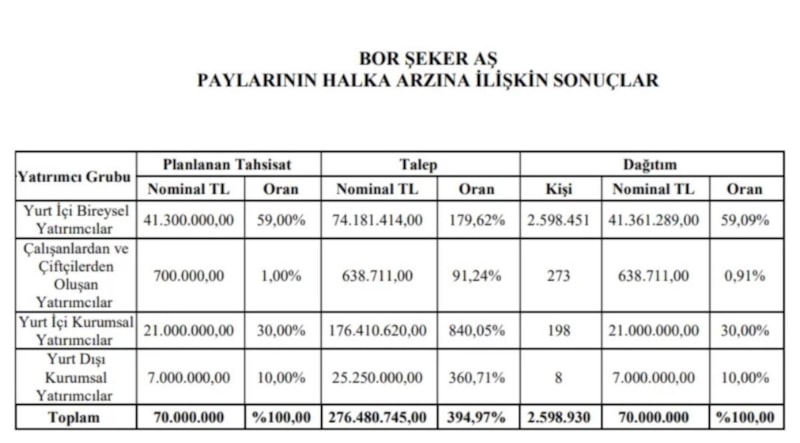 Geçtiğimiz günlerde halka arz için talep toplama işlemlerini gerçekleştiren Bor Şeker'in halka arz sonuçları merak uyandırdı.