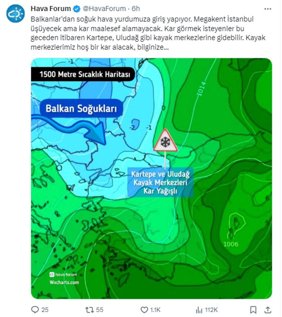 "Balkanlardan soğuk hava yurdumuza giriş yapıyor. Megakent İstanbul üşüyecek ama kar maalesef alamayacak. Kar görmek isteyenler bu geceden itibaren Kartepe, Uludağ gibi kayak merkezlerine gidebilir. Kayak merkezlerimiz hoş bir kar alacak, bilginize..."