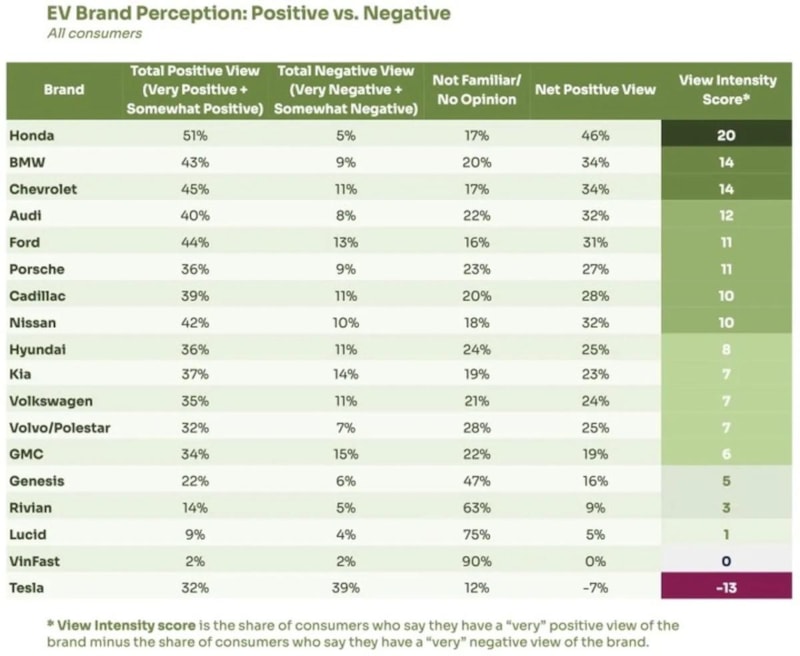 Söz konusu raporda yer alan verilere göre Tesla, tüketici gözünden en olumsuz algıya sahip marka konumunda yer aldı.