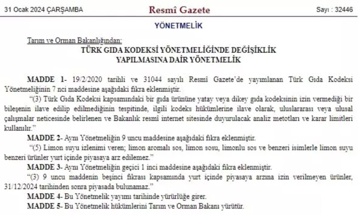 Resmi Gazete'de yayımlanan karara göre, limon suyu izlenimi veren; limon aromalı sos, limon sosu, limonlu sos ve benzeri isimlerle limon suyu benzeri ürünlerin satışına yasak geldi.