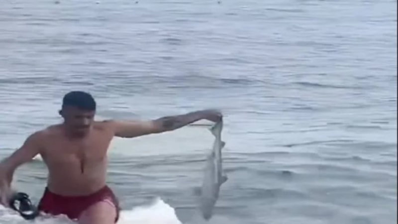 Antalya'nın Konyaaltı sahilinde denize giren bir vatandaş, denizden yavru bir köpekbalığı çıkardı.