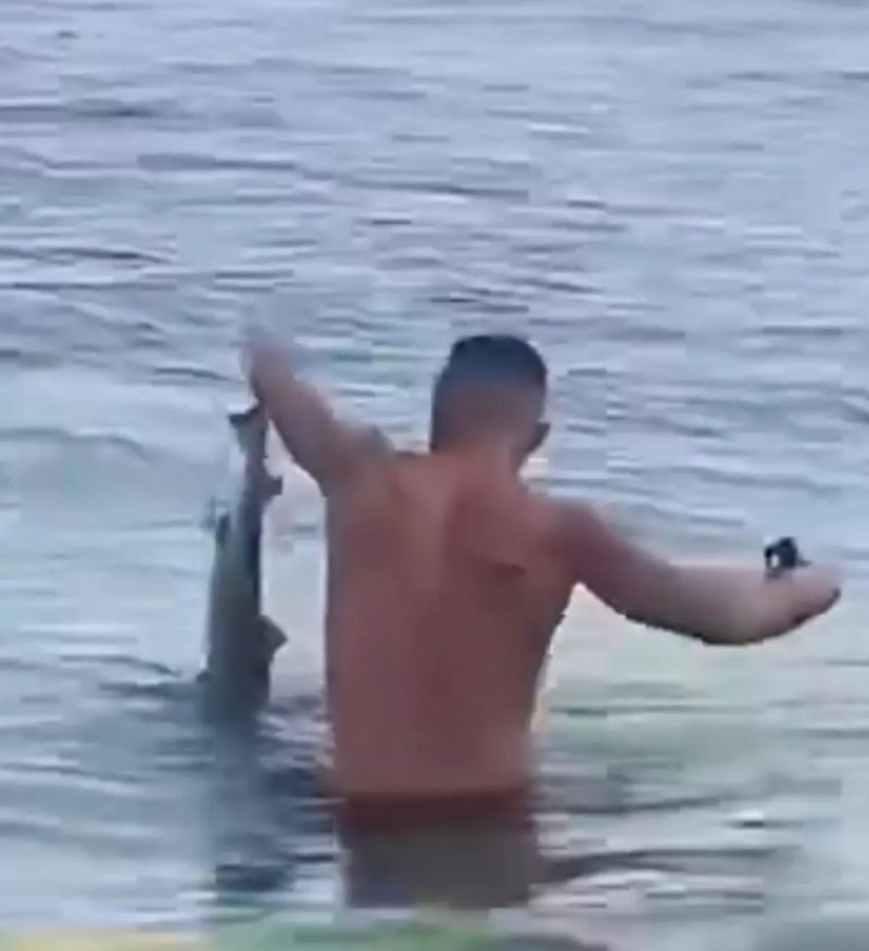 Denizde yüzdüğü sırada yavru köpekbalığını fark eden vatandaş, dikkatle ve özenle hayvanı sudan çıkardı.