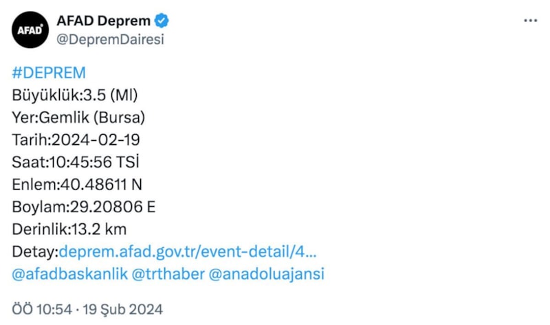 AFAD, Bursa'da Türkiye saati ile 10:45:56'da 3.5 büyüklüğünde bir deprem meydana geldiğini duyurdu. Depremin derinliği 13.2 km olarak açıklandı.