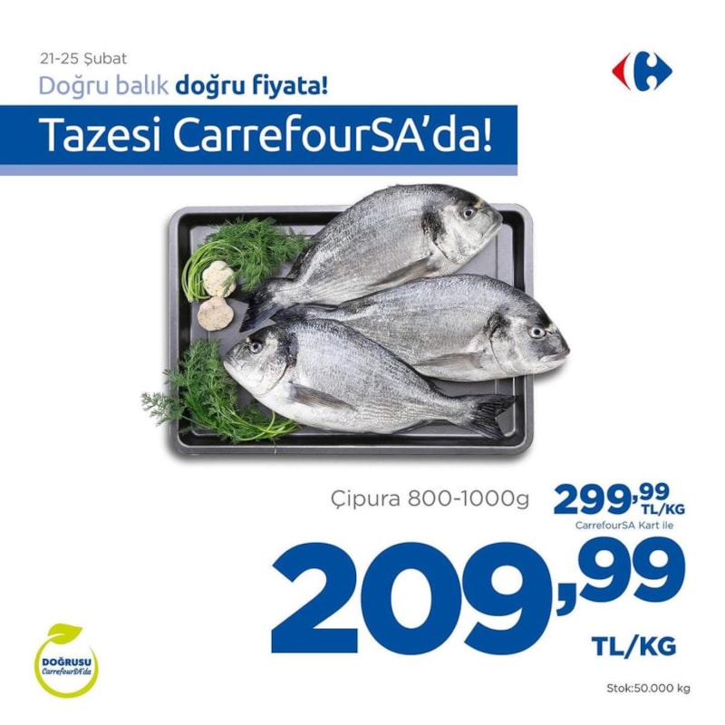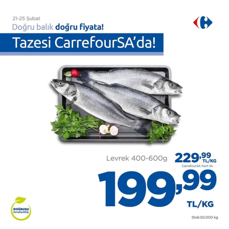 CarrefourSA, bu öneriyi dikkate alarak çipura ve levrek gibi sevilen balık türlerine yönelik büyük indirimlerle müşterilerine yüzde 30'a varan fiyat avantajları sunuyor.