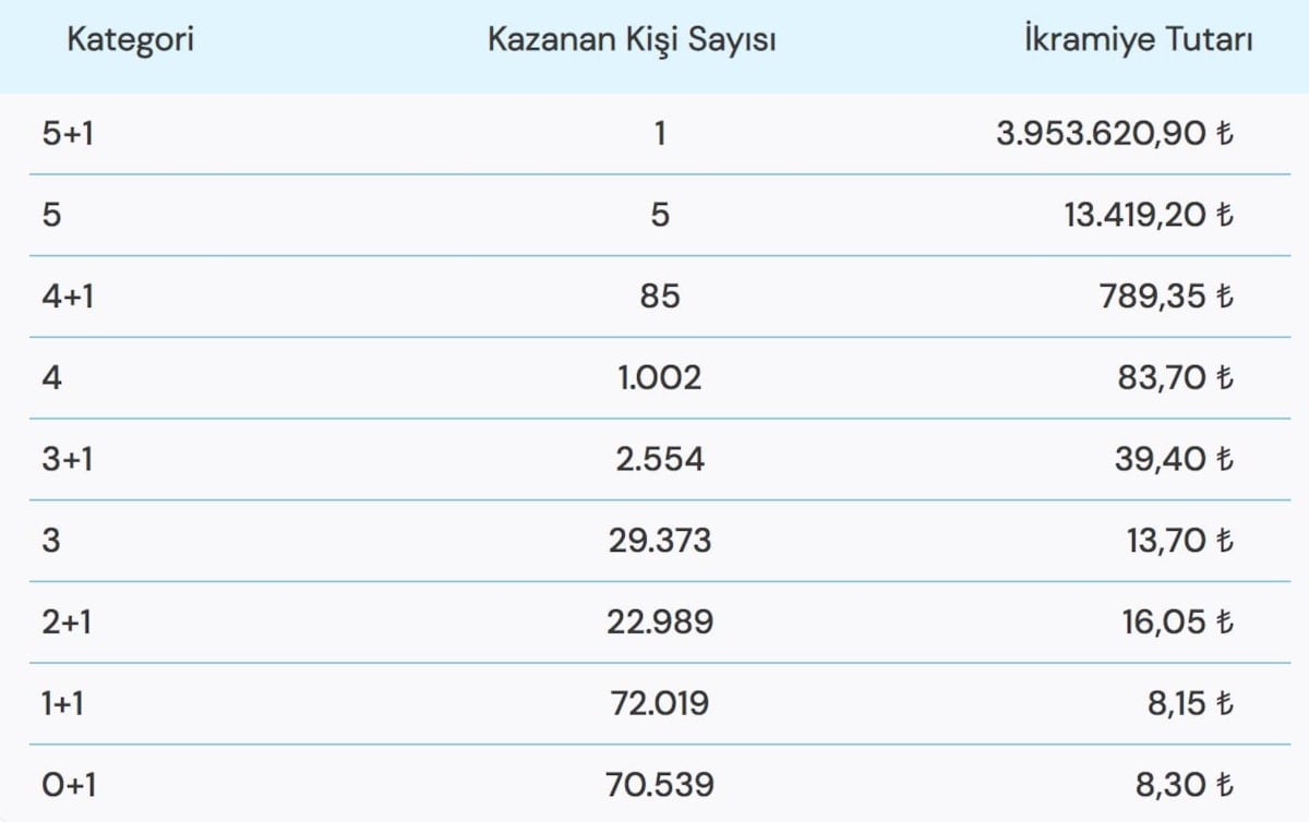 Bu akşam yapılan çekiliş sonuçlarına göre 5+1 bilen 1 talihli vatandaş 3.953.620,90 TL'lik büyük ödülün sahibi oldu.