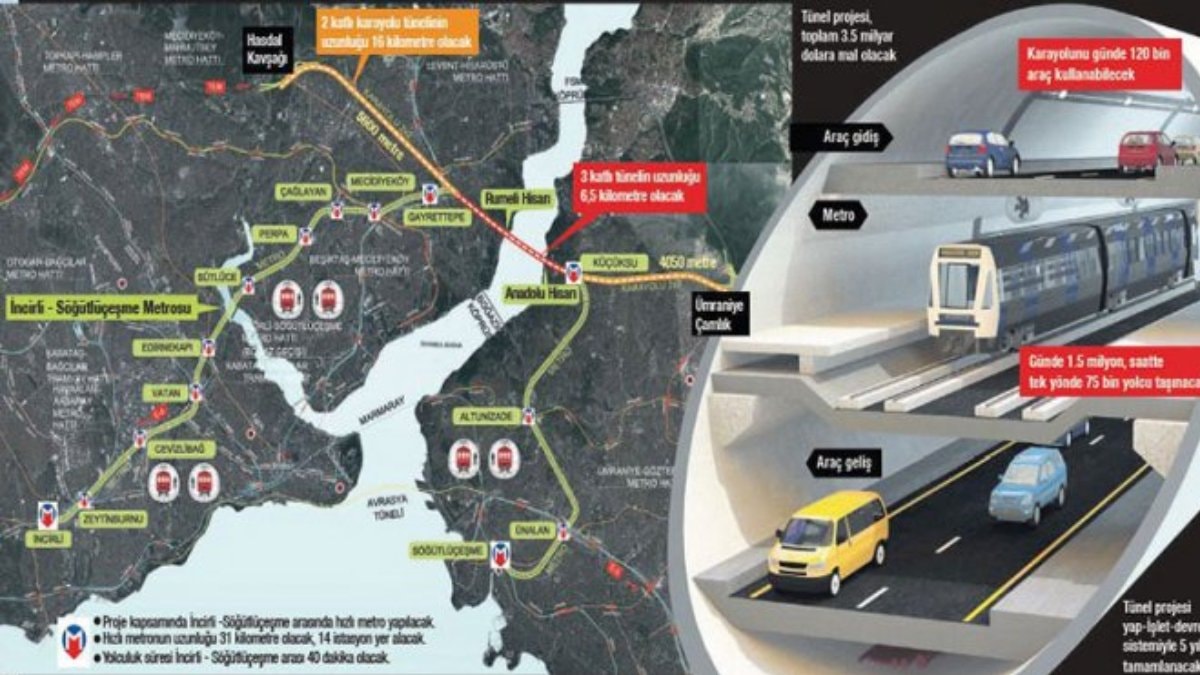 İstanbul Boğazı’nın altından geçecek 3 katlı Büyük İstanbul Tüneli’nde, tek tüpte hem karayolu hem de demiryolu olacak. Tünelde, ortadan geliş ve gidiş olmak üzere demiryolu, üst ve altta da lastik tekerli araç geçişine uygun iki şeritli yol bulunacak.