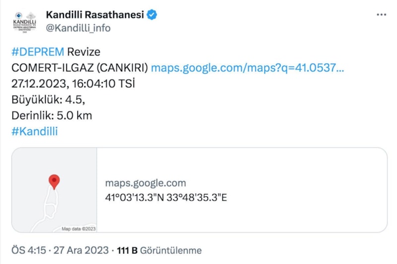 Kandilli Rasathanesi, Cömert-Ilgaz(ÇANKIRI) merkezli bir deprem meydana geldiğini açıkladı.