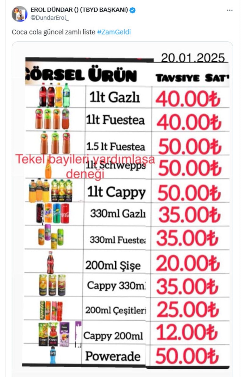 Tekel Bayileri Yardımlaşma Derneği (TBYD) Başkanı Erol Dündar, sosyal medya platformu X üzerinden yaptığı açıklamada, alkolsüz içecek grubuna gelen yeni zamları paylaştı.