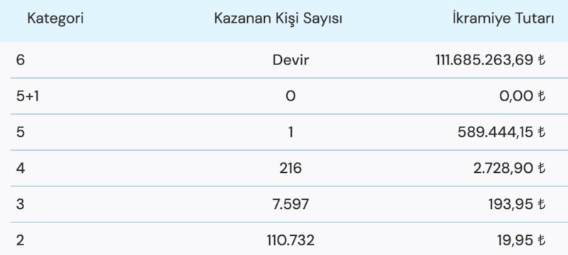 Büyük ikramiyenin 111.685.263,69 TL olduğu çekiliş sonuçlarına göre 6 bilen çıkmadığı için büyük ikramiye bir sonraki çekilişe devretti.
