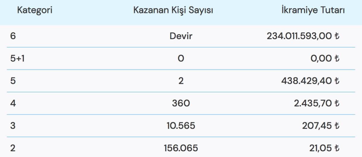 Büyük ikramiyenin 234.011.593,00 TL olduğu çekiliş sonuçlarına göre 6 bilen çıkmadığı için büyük ikramiye devretti.