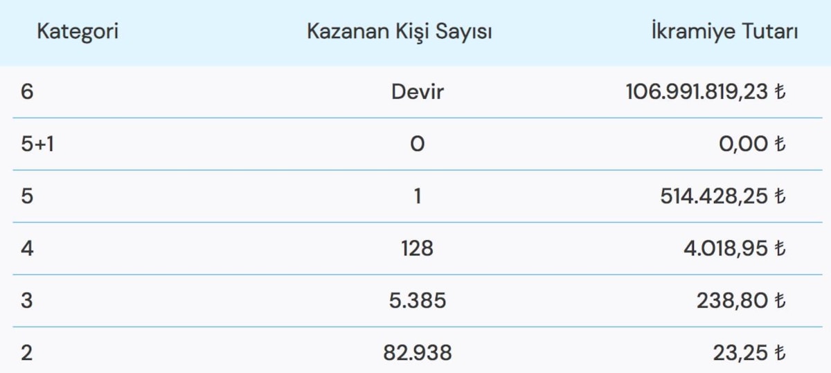 Büyük ikramiyenin 106.991.819,23 TL olduğu çekiliş sonuçlarına göre 6 bilen çıkmadığı için büyük ikramiye bir sonraki çekilişe devretti.
