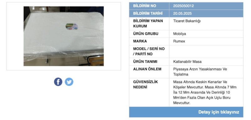 Bakanlığın Güvensiz Ürün Bilgi Sistemi'nde yapılan güncelleme ile Rumex markasına ait katlanabilir masa modelinin piyasadan toplatılmasına karar verildi.