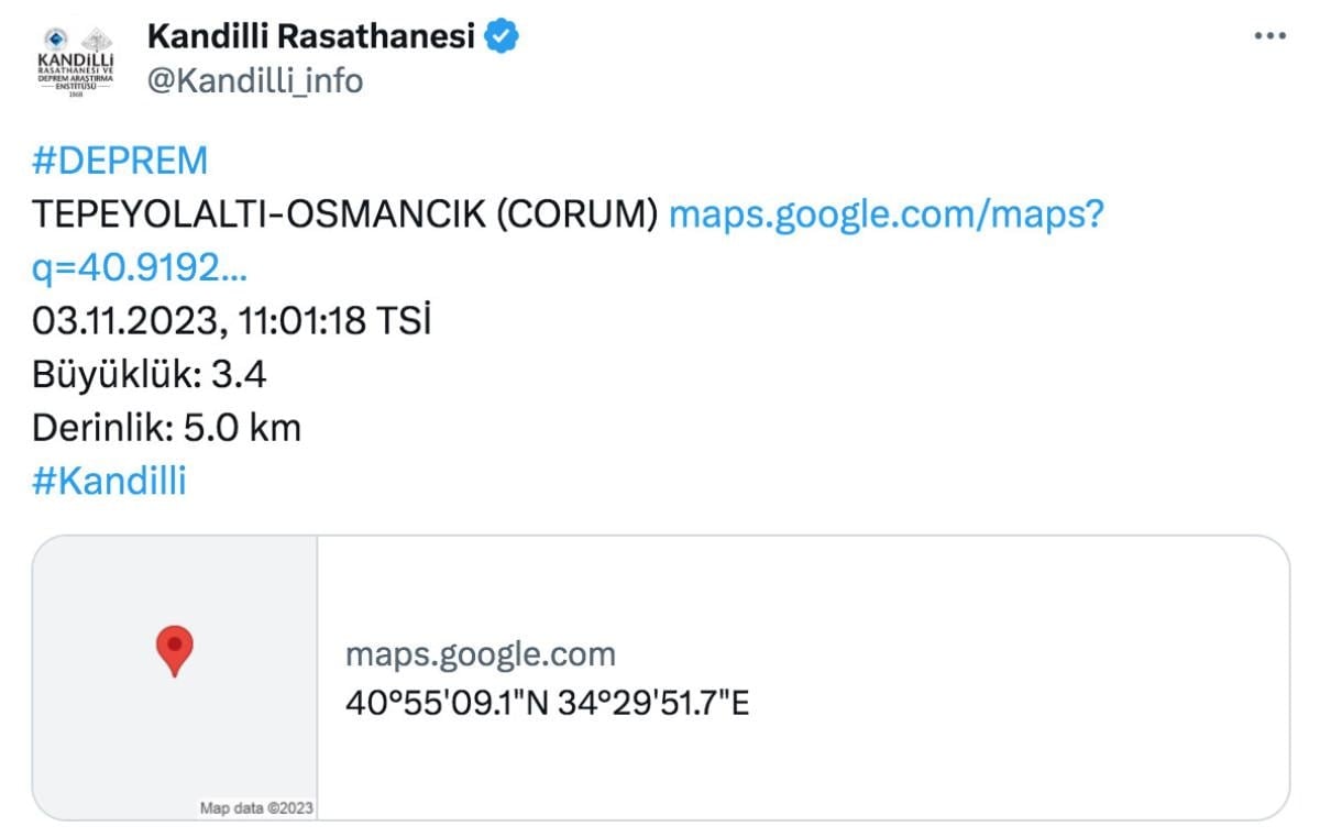 Çorum'da Türkiye saati ile 11:01:18'de 3.4 büyüklüğünde bir deprem meydana geldi.
