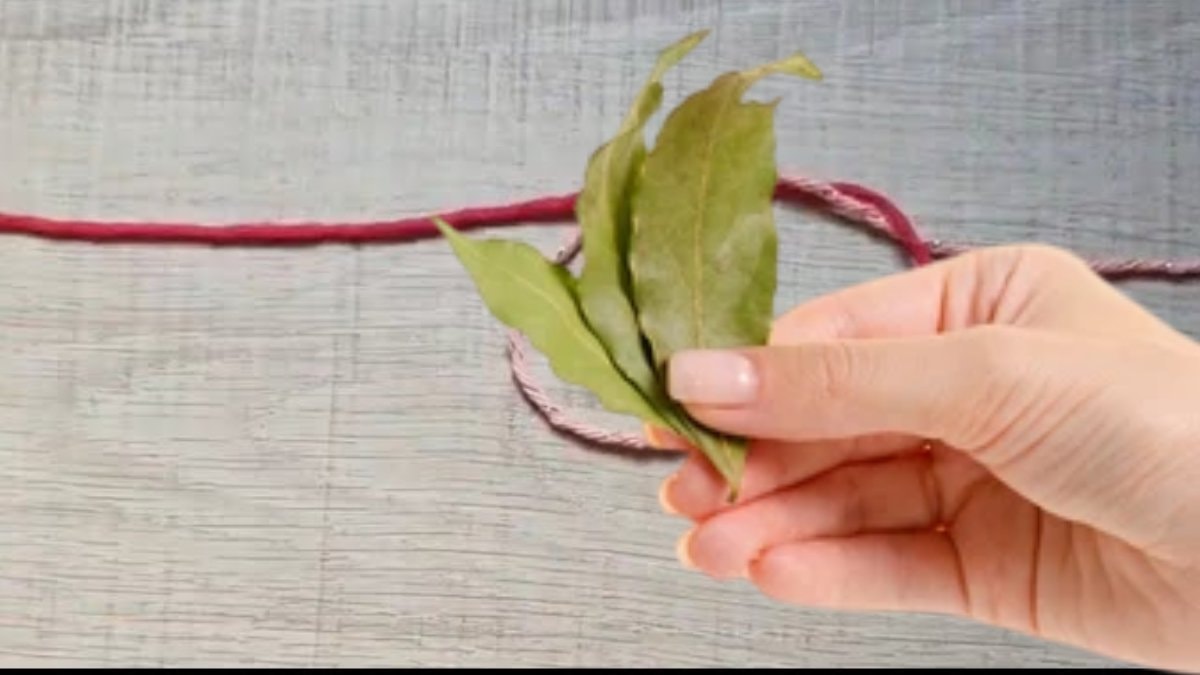 4 adet defne yaprağını bir araya getirin ve kırmızı bir iplikle bağlayın.