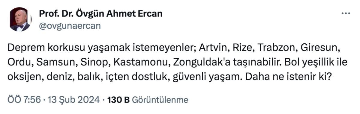 "Deprem korkusu yaşamak istemeyenler; Artvin, Rize, Trabzon, Giresun, Ordu, Samsun, Sinop, Kastamonu, Zonguldak'a taşınabilir. Bol yeşillik ile oksijen, deniz, balık, içten dostluk, güvenli yaşam. Daha ne istenir ki?"