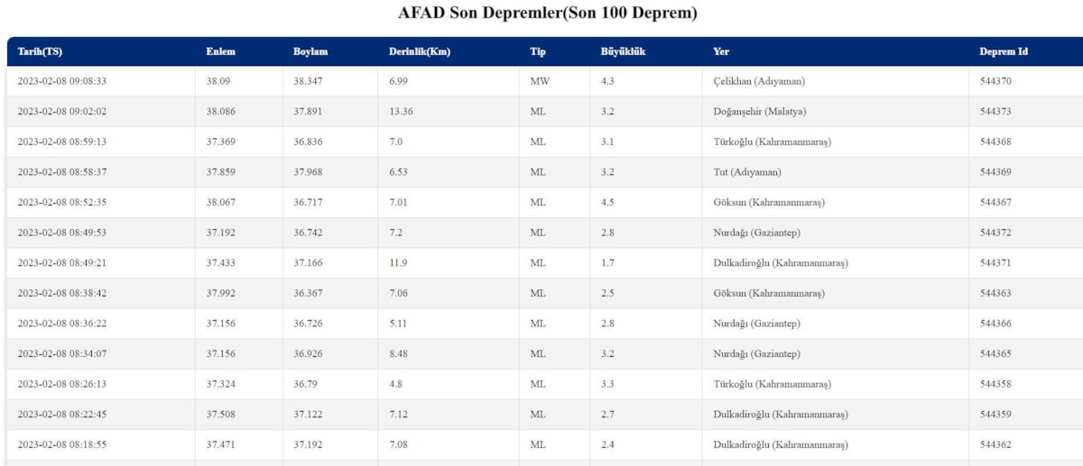 14 Şubat 2023 AFAD deprem verileri: