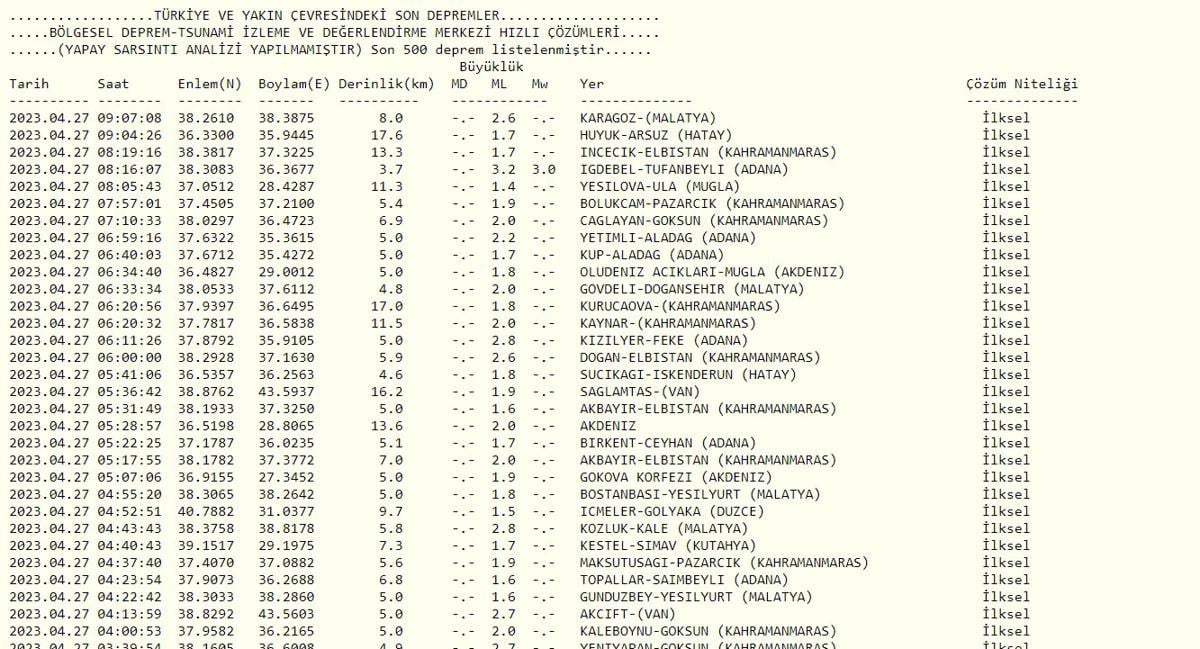 27 Nisan 2023 AFAD deprem verileri: