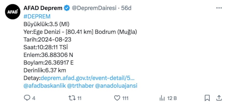 AFAD, Muğla'da Türkiye saati ile 10:28:11'de 3.5 büyüklüğünde bir deprem meydana geldiğini duyurdu. Depremin derinliği 6.37 km olarak açıklandı.