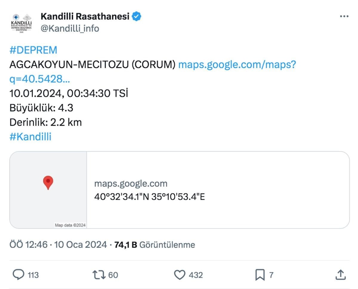 Çorum'da Türkiye saati ile 00:34:30'da bir deprem meydana geldi. Kandilli Rasathanesi depremin büyüklüğünü 4.3 olarak açıkladı.