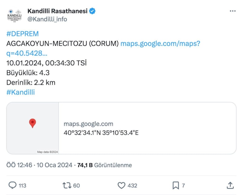Çorum ve çevresinde hissedilen bir deprem yaşandı. Depremin merkez üssü Ağcakoyun-Mecitözü olarak açıklandı.