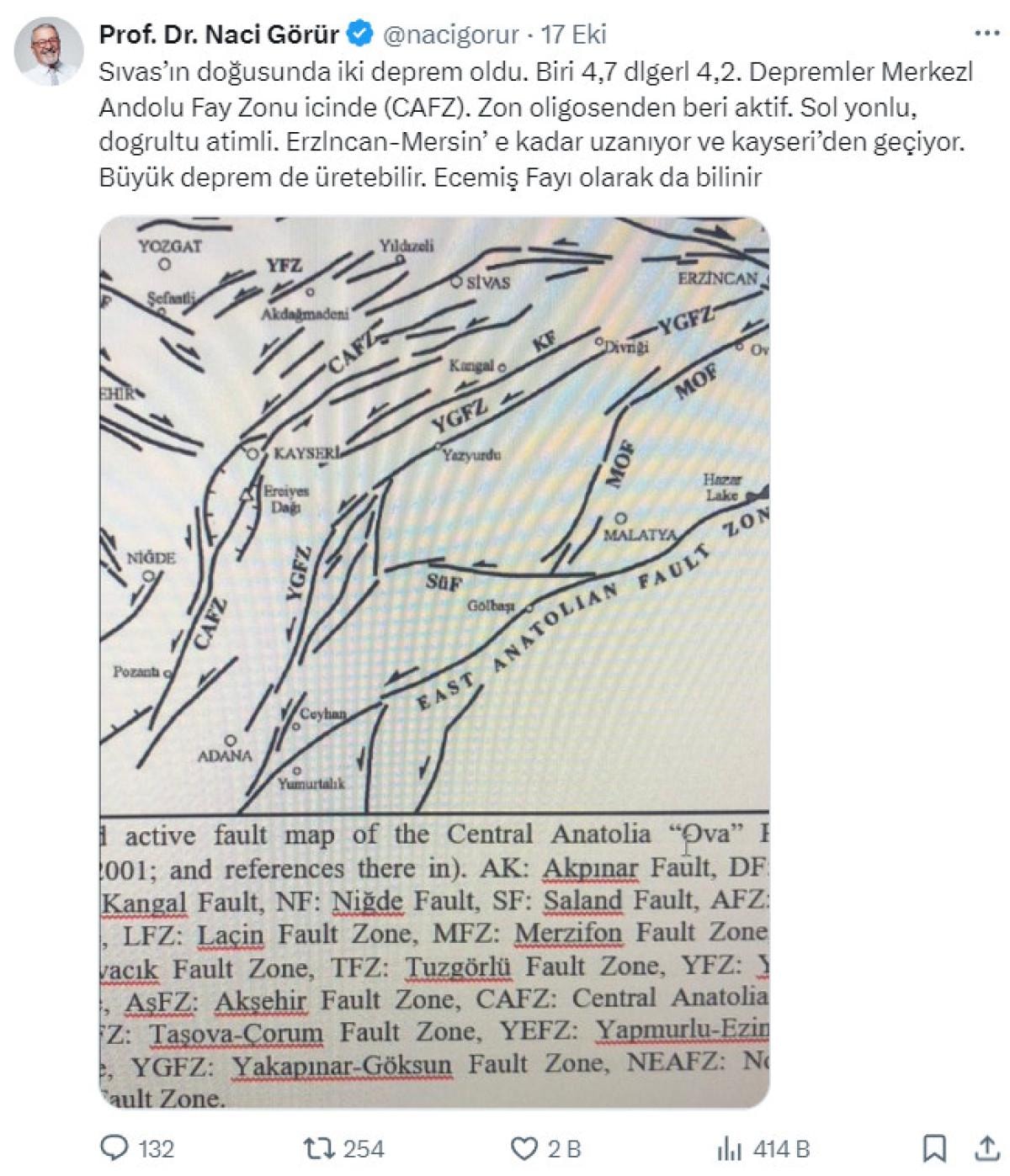 Görür depremler hakkında yaptığı uyarısında, "Sivas'ın doğusunda iki deprem oldu. Biri 4,7 diğeri 4,2. Depremler Merkezi Andolu Fay Zonu içinde (CAFZ). Zon oligosenden beri aktif. Sol yönlü doğrultu atımlı. Erzincan-Mersin'e kadar uzanıyor ve Kayseri’den geçiyor. Büyük deprem de üretebilir. Ecemiş Fayı olarak da bilinir." ifadelerini kullandı.