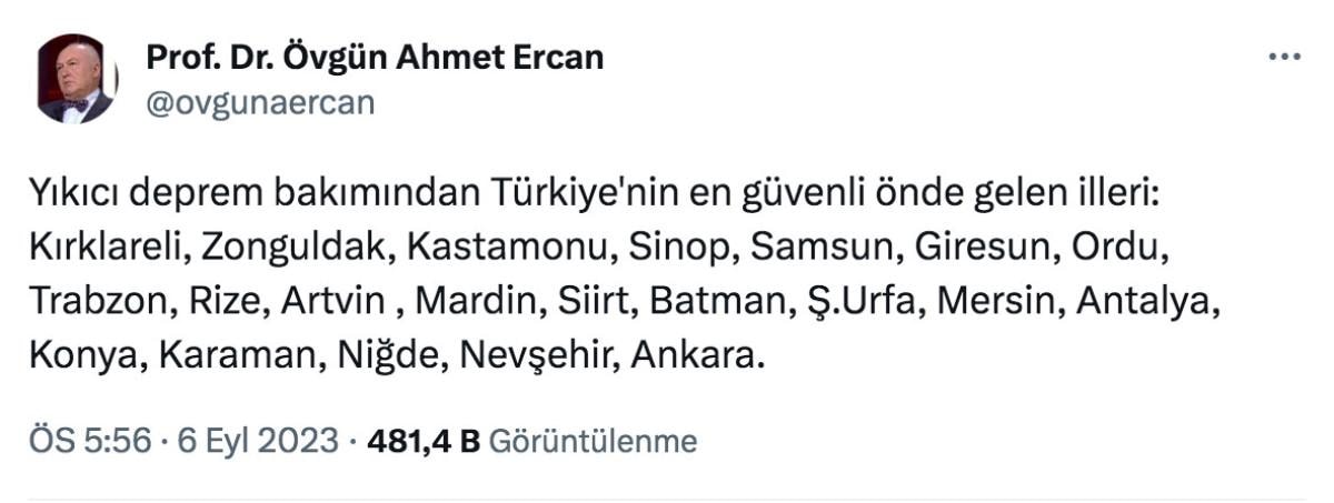 Prof. Ahmet Ercan, yıkıcı depreme karşı Türkiye'nin en güvenli 21 ilini açıkladı.