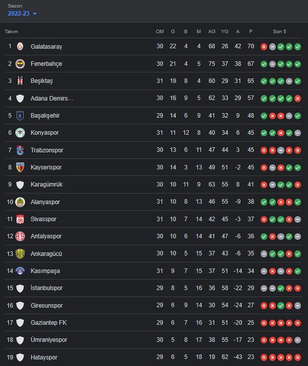 Daralan puan farklarının ardından takımların güncel puan durumları araştırılmaya başladı. Sarı-kırmızılılar 70 puanla liderliğini koruyor. İşte Süper Lig güncel puan durumu…