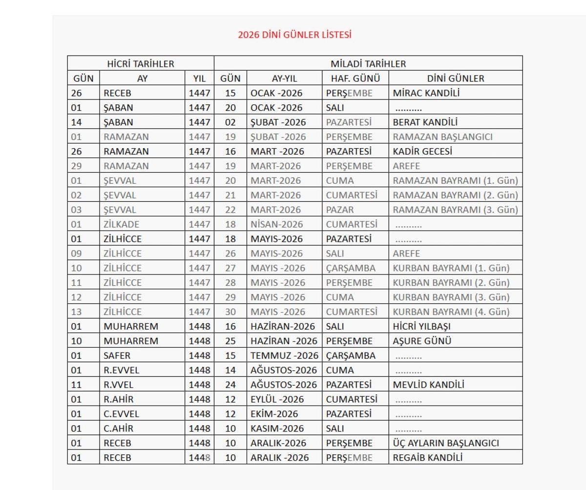 - 2026 yılı dini günler takvimi, bu günlerin tarih ve hangi günlere denk geldiğini kapsamaktadır.