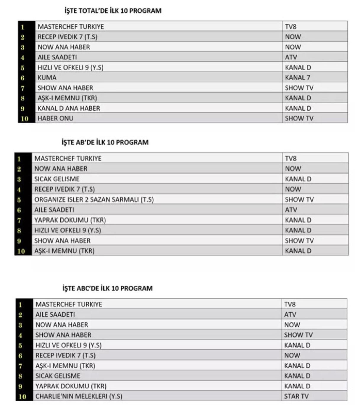 Her gün bir önceki güne ait Total, AB ve ABC sıralaması belli olurken dünün reyting sonuçları merakla bekleniyor.