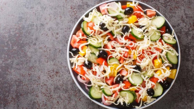 7-Horiatiki - Yunanistan: Domates, dilimlenmiş kırmızı soğan, iri dilimlenmiş salatalık, zeytin, beyaz peynir, kekik, tuz, karabiber ve isteğe bağlı sos kullanılarak hazırlanır.