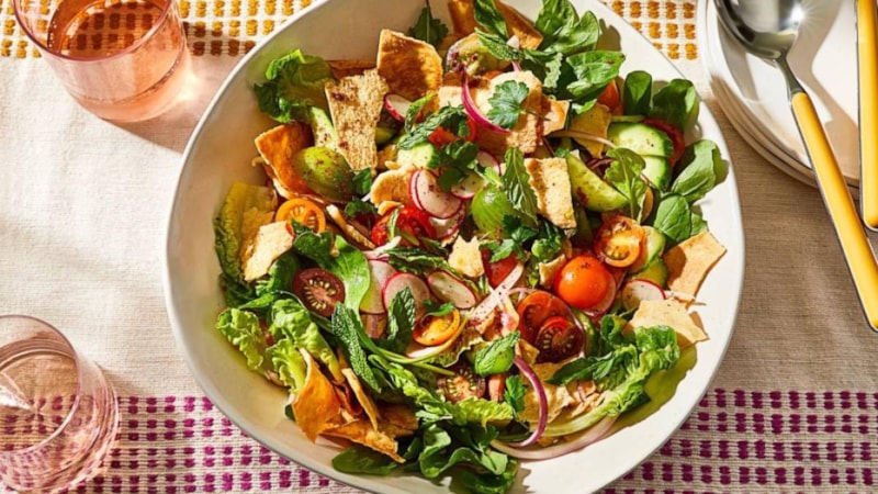 2-Fattoush (Fettuş) - Lübnan: Geleneksel lavaş parçalarının üzerine marul, turp, çıtır salatalık, domates, biber ve soğan gibi sebzelerle hazırlanır.
