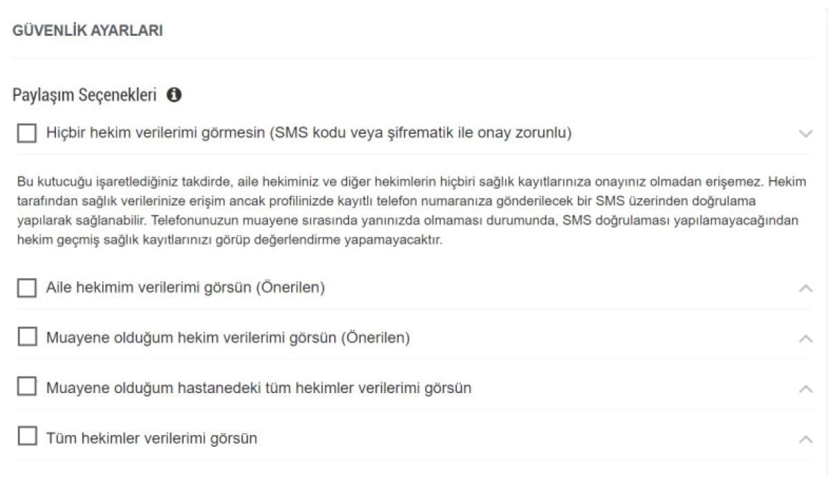Güvenlik ekranını açtığımızda, karşımıza "Paylaşım Seçenekleri" çıkacaktır. Bu sayfada, eğer kimsenin e-Nabız bilgilerinizi görmesini istemiyor iseniz, “Verilerimi kimse görmesin” seçeneğini işaretleyebilirsiniz.