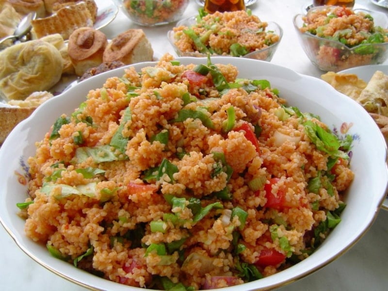 Genellikle bulgur, ince doğranmış yeşillikler, baharatlar, salça ve limon suyu gibi malzemelerle hazırlanır.